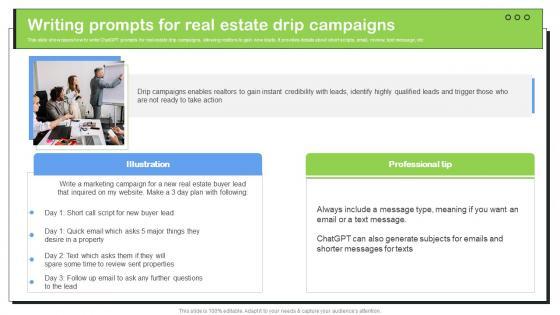 This slide showcases how to write ChatGPT prompts for real estate drip campaigns, allowing realtors to gain new leads. It provides details about short scripts, email, review, text message, etc. Whether you have daily or monthly meetings, a brilliant presentation is necessary. Transforming Real Estate Writing Prompts For Real Estate Drip Campaigns ChatGPT SS V can be your best option for delivering a presentation. Represent everything in detail using Transforming Real Estate Writing Prompts For Real Estate Drip Campaigns ChatGPT SS V and make yourself stand out in meetings. The template is versatile and follows a structure that will cater to your requirements. All the templates prepared by Slidegeeks are easy to download and edit. Our research experts have taken care of the corporate themes as well. So, give it a try and see the results. This slide showcases how to write ChatGPT prompts for real estate drip campaigns, allowing realtors to gain new leads. It provides details about short scripts, email, review, text message, etc.
