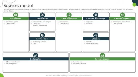 This slide presents a business model canvas for online real estate platform. It includes details about key partners, activities, resources, value proposition, customer relationships, channels, customer segments, cost structure and revenue streams. Boost your pitch with our creative Business Model Land And Property Marketplace Pitch Deck PPT Example. Deliver an awe-inspiring pitch that will mesmerize everyone. Using these presentation templates you will surely catch everyones attention. You can browse the ppts collection on our website. We have researchers who are experts at creating the right content for the templates. So you do not have to invest time in any additional work. Just grab the template now and use them. This slide presents a business model canvas for online real estate platform. It includes details about key partners, activities, resources, value proposition, customer relationships, channels, customer segments, cost structure and revenue streams.