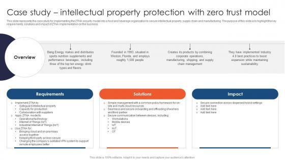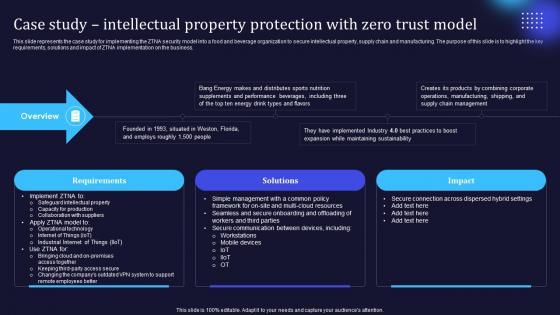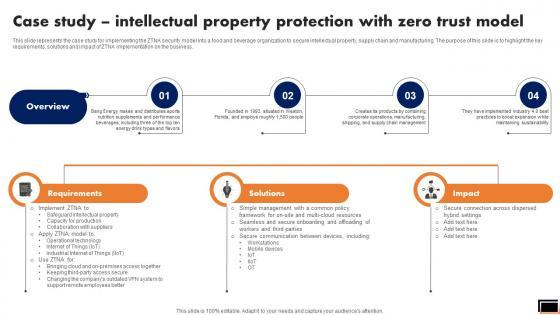This slide represents the case study for implementing the ZTNA security model into a food and beverage organization to secure intellectual property, supply chain and manufacturing. The purpose of this slide is to highlight the key requirements, solutions and impact of ZTNA implementation on the business. From laying roadmaps to briefing everything in detail, our templates are perfect for you. You can set the stage with your presentation slides. All you have to do is download these easy-to-edit and customizable templates. Zero Trust Model Case Study Intellectual Property Protection will help you deliver an outstanding performance that everyone would remember and praise you for. Do download this presentation today. This slide represents the case study for implementing the ZTNA security model into a food and beverage organization to secure intellectual property, supply chain and manufacturing. The purpose of this slide is to highlight the key requirements, solutions and impact of ZTNA implementation on the business.
