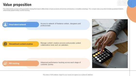 This slide exhibits a unique selling proposition strategy that helps to differentiate company products and services and develop a competitive advantage. The company value proposition includes great talent network, streamlined content creation, and ROI tracking. Explore a selection of the finest Value Proposition Content Management Platform Investor Funding Elevator Pitch Deck here. With a plethora of professionally designed and pre-made slide templates, you can quickly and easily find the right one for your upcoming presentation. You can use our Value Proposition Content Management Platform Investor Funding Elevator Pitch Deck to effectively convey your message to a wider audience. Slidegeeks has done a lot of research before preparing these presentation templates. The content can be personalized and the slides are highly editable. Grab templates today from Slidegeeks. This slide exhibits a unique selling proposition strategy that helps to differentiate company products and services and develop a competitive advantage. The company value proposition includes great talent network, streamlined content creation, and ROI tracking.