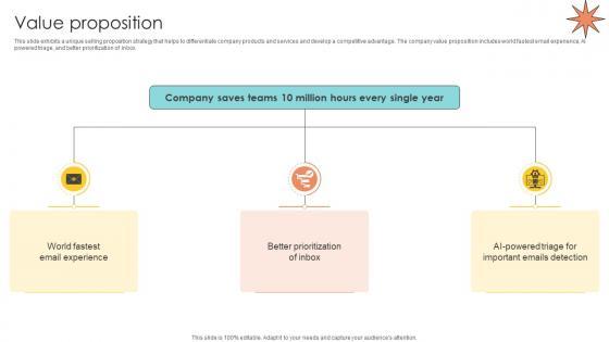 This slide exhibits a unique selling proposition strategy that helps to differentiate company products and services and develop a competitive advantage. The company value proposition includes world fastest email experience, AI powered triage, and better prioritization of inbox. Explore a selection of the finest Value Proposition Email Management Technology Pitch Deck here. With a plethora of professionally designed and pre-made slide templates, you can quickly and easily find the right one for your upcoming presentation. You can use our Value Proposition Email Management Technology Pitch Deck to effectively convey your message to a wider audience. Slidegeeks has done a lot of research before preparing these presentation templates. The content can be personalized and the slides are highly editable. Grab templates today from Slidegeeks. This slide exhibits a unique selling proposition strategy that helps to differentiate company products and services and develop a competitive advantage. The company value proposition includes world fastest email experience, AI powered triage, and better prioritization of inbox.