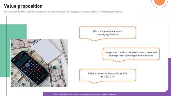 This slide caters to the USP Unique Selling Proposition of a financial technology company, helping people to invest, save and manage their spending with automation. Explore a selection of the finest Value Proposition Financial Management Software Capital Raising Deck Pictures Pdf here. With a plethora of professionally designed and pre made slide templates, you can quickly and easily find the right one for your upcoming presentation. You can use our Value Proposition Financial Management Software Capital Raising Deck Pictures Pdf to effectively convey your message to a wider audience. Slidegeeks has done a lot of research before preparing these presentation templates. The content can be personalized and the slides are highly editable. Grab templates today from Slidegeeks. This slide caters to the USP Unique Selling Proposition of a financial technology company, helping people to invest, save and manage their spending with automation.