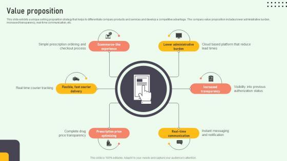 This slide exhibits a unique selling proposition strategy that helps to differentiate company products and services and develop a competitive advantage. The company value proposition includes lower administrative burden, increased transparency, real-time communication, etc. Here you can discover an assortment of the finest PowerPoint and Google Slides templates. With these templates, you can create presentations for a variety of purposes while simultaneously providing your audience with an eye-catching visual experience. Download Value Proposition Online Medication Management Platform Pitch Deck to deliver an impeccable presentation. These templates will make your job of preparing presentations much quicker, yet still, maintain a high level of quality. Slidegeeks has experienced researchers who prepare these templates and write high-quality content for you. Later on, you can personalize the content by editing the Value Proposition Online Medication Management Platform Pitch Deck. This slide exhibits a unique selling proposition strategy that helps to differentiate company products and services and develop a competitive advantage. The company value proposition includes lower administrative burden, increased transparency, real-time communication, etc.