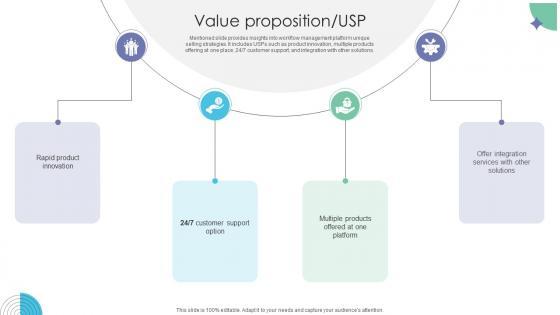 Mentioned slide provides insights into workflow management platform unique selling strategies. It includes USPs such as product innovation, multiple products offering at one place, 24 7 customer support, and integration with other solutions. Explore a selection of the finest Value Proposition USP Workflow Management Investor Funding Elevator Pitch Deck here. With a plethora of professionally designed and pre-made slide templates, you can quickly and easily find the right one for your upcoming presentation. You can use our Value Proposition USP Workflow Management Investor Funding Elevator Pitch Deck to effectively convey your message to a wider audience. Slidegeeks has done a lot of research before preparing these presentation templates. The content can be personalized and the slides are highly editable. Grab templates today from Slidegeeks. Mentioned slide provides insights into workflow management platform unique selling strategies. It includes USPs such as product innovation, multiple products offering at one place, 24 7 customer support, and integration with other solutions.