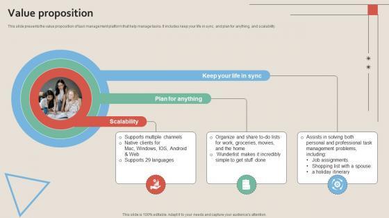 This slide presents the value proposition of task management platform that help manage tasks. It includes keep your life in sync, and plan for anything, and scalability.Explore a selection of the finest Value Proposition Work Management Tool Pitch Deck here. With a plethora of professionally designed and pre-made slide templates, you can quickly and easily find the right one for your upcoming presentation. You can use our Value Proposition Work Management Tool Pitch Deck to effectively convey your message to a wider audience. Slidegeeks has done a lot of research before preparing these presentation templates. The content can be personalized and the slides are highly editable. Grab templates today from Slidegeeks. This slide presents the value proposition of task management platform that help manage tasks. It includes keep your life in sync, and plan for anything, and scalability.