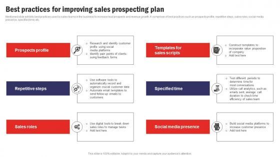 Mentioned slide exhibits best practices used by sales teams in the business to increase lead prospects and revenue growth. It comprises of best practices such as prospects profile, repetitive steps, sales roles, social media presence, specified time, etc. Showcasing this set of slides titled Best Practices For Improving Sales Prospecting Plan Background Pdf. The topics addressed in these templates are Social Media Platforms, Organize Crucial Customer Data, Determine. All the content presented in this PPT design is completely editable. Download it and make adjustments in color, background, font etc. as per your unique business setting. Mentioned slide exhibits best practices used by sales teams in the business to increase lead prospects and revenue growth. It comprises of best practices such as prospects profile, repetitive steps, sales roles, social media presence, specified time, etc.