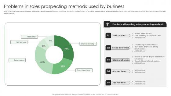 This slide showcases issues business is facing with existing sales prospecting methods. It includes problems such as unable to nurture deeper relationships with clients, build brand awareness among target audience and slowed sales process. Do you have to make sure that everyone on your team knows about any specific topic I yes, then you should give Process Enhancement Plan To Boost Sales Performance Problems In Sales Prospecting Methods Used By Business Graphics PDF a try. Our experts have put a lot of knowledge and effort into creating this impeccable Process Enhancement Plan To Boost Sales Performance Problems In Sales Prospecting Methods Used By Business Graphics PDF. You can use this template for your upcoming presentations, as the slides are perfect to represent even the tiniest detail. You can download these templates from the Slidegeeks website and these are easy to edit. So grab these today.