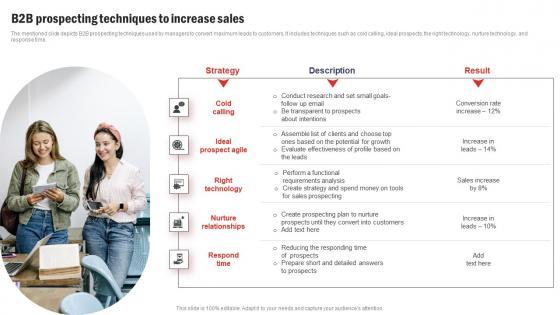 The mentioned slide depicts B2B prospecting techniques used by managers to convert maximum leads to customers. It includes techniques such as cold calling, ideal prospects, the right technology, nurture technology, and response time. Showcasing this set of slides titled B2B Prospecting Techniques To Increase Sales Sample Pdf. The topics addressed in these templates are Strategy, Potential For Growth, Requirements Analysis. All the content presented in this PPT design is completely editable. Download it and make adjustments in color, background, font etc. as per your unique business setting. The mentioned slide depicts B2B prospecting techniques used by managers to convert maximum leads to customers. It includes techniques such as cold calling, ideal prospects, the right technology, nurture technology, and response time.