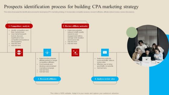 This slide showcases the identification process for developing CPA marketing strategy. It incorporates competitor analysis, research affiliates, affiliate network review, review site analysis. This Prospects Identification Process For Building CPA Marketing Strategy Ppt Gallery Structure PDF is perfect for any presentation, be it in front of clients or colleagues. It is a versatile and stylish solution for organizing your meetings. The product features a modern design for your presentation meetings. The adjustable and customizable slides provide unlimited possibilities for acing up your presentation. Slidegeeks has done all the homework before launching the product for you. So, do not wait, grab the presentation templates today