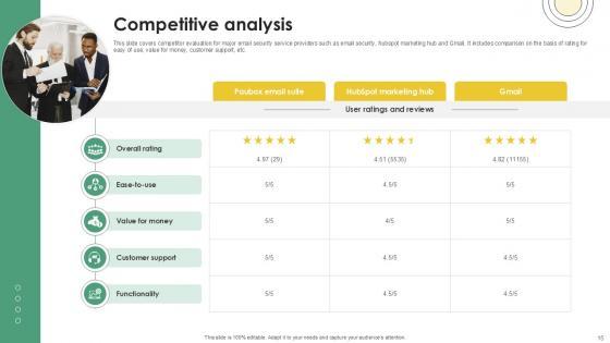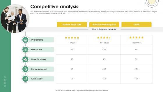 This slide covers competitor evaluation for major email security service providers such as email security, hubspot marketing hub and Gmail. It includes comparison on the basis of rating for easy of use, value for money, customer support, etc. Do you have to make sure that everyone on your team knows about any specific topic I yes, then you should give Competitive Analysis Email And Data Protection Platform Capital Funding Pitch Deck PPT Example a try. Our experts have put a lot of knowledge and effort into creating this impeccable Competitive Analysis Email And Data Protection Platform Capital Funding Pitch Deck PPT Example. You can use this template for your upcoming presentations, as the slides are perfect to represent even the tiniest detail. You can download these templates from the Slidegeeks website and these are easy to edit. So grab these today This slide covers competitor evaluation for major email security service providers such as email security, hubspot marketing hub and Gmail. It includes comparison on the basis of rating for easy of use, value for money, customer support, etc.