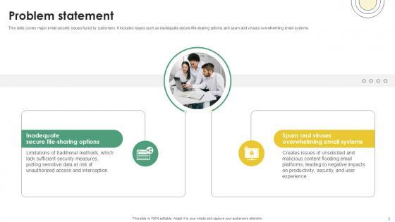 This slide covers major email security issues faced by customers. It includes issues such as inadequate secure file-sharing options and spam and viruses overwhelming email systems. Formulating a presentation can take up a lot of effort and time, so the content and message should always be the primary focus. The visuals of the PowerPoint can enhance the presenters message, so our Problem Statement Email And Data Protection Platform Capital Funding Pitch Deck PPT Slide was created to help save time. Instead of worrying about the design, the presenter can concentrate on the message while our designers work on creating the ideal templates for whatever situation is needed. Slidegeeks has experts for everything from amazing designs to valuable content, we have put everything into Problem Statement Email And Data Protection Platform Capital Funding Pitch Deck PPT Slide This slide covers major email security issues faced by customers. It includes issues such as inadequate secure file-sharing options and spam and viruses overwhelming email systems.
