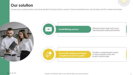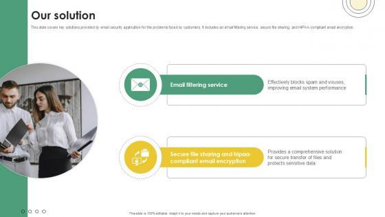 This slide covers key solutions provided by email security application for the problems faced by customers. It includes an email filtering service, secure file sharing, and HIPAA-compliant email encryption. Make sure to capture your audiences attention in your business displays with our gratis customizable Our Solution Email And Data Protection Platform Capital Funding Pitch Deck PPT Sample. These are great for business strategies, office conferences, capital raising or task suggestions. If you desire to acquire more customers for your tech business and ensure they stay satisfied, create your own sales presentation with these plain slides. This slide covers key solutions provided by email security application for the problems faced by customers. It includes an email filtering service, secure file sharing, and HIPAA-compliant email encryption.