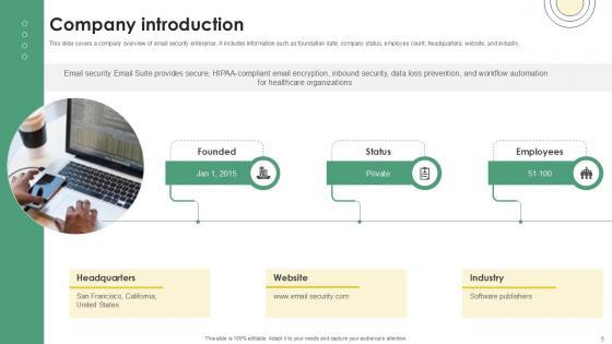 This slide covers a company overview of email security enterprise. It includes information such as foundation date, company status, employee count, headquarters, website, and industry. Do you have to make sure that everyone on your team knows about any specific topic I yes, then you should give Company Introduction Email And Data Protection Platform Capital Funding Pitch Deck PPT Example a try. Our experts have put a lot of knowledge and effort into creating this impeccable Company Introduction Email And Data Protection Platform Capital Funding Pitch Deck PPT Example. You can use this template for your upcoming presentations, as the slides are perfect to represent even the tiniest detail. You can download these templates from the Slidegeeks website and these are easy to edit. So grab these today This slide covers a company overview of email security enterprise. It includes information such as foundation date, company status, employee count, headquarters, website, and industry.
