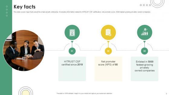 This slide covers major facts about the email security enterprise. It includes information related to HITRUST CSF certification, net promoter score, 5000 fastest-growing privately owned companies. If you are looking for a format to display your unique thoughts, then the professionally designed Key Facts Email And Data Protection Platform Capital Funding Pitch Deck PPT PowerPoint is the one for you. You can use it as a Google Slides template or a PowerPoint template. Incorporate impressive visuals, symbols, images, and other charts. Modify or reorganize the text boxes as you desire. Experiment with shade schemes and font pairings. Alter, share or cooperate with other people on your work. Download Key Facts Email And Data Protection Platform Capital Funding Pitch Deck PPT PowerPoint and find out how to give a successful presentation. Present a perfect display to your team and make your presentation unforgettable. This slide covers major facts about the email security enterprise. It includes information related to HITRUST CSF certification, net promoter score, 5000 fastest-growing privately owned companies.