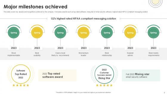This slide covers key awards and recognitions achieved by the company. It includes awards such as top rated software, rising star of email security software, highest rated HIPAA compliant messaging solution. If you are looking for a format to display your unique thoughts, then the professionally designed Major Milestones Achieved Email And Data Protection Platform Capital Funding Pitch Deck PPT Slide is the one for you. You can use it as a Google Slides template or a PowerPoint template. Incorporate impressive visuals, symbols, images, and other charts. Modify or reorganize the text boxes as you desire. Experiment with shade schemes and font pairings. Alter, share or cooperate with other people on your work. Download Major Milestones Achieved Email And Data Protection Platform Capital Funding Pitch Deck PPT Slide and find out how to give a successful presentation. Present a perfect display to your team and make your presentation unforgettable. This slide covers key awards and recognitions achieved by the company. It includes awards such as top rated software, rising star of email security software, highest rated HIPAA compliant messaging solution.
