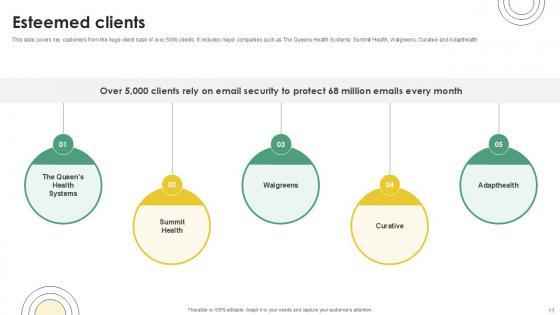 This slide covers key customers from the huge client base of over 5000 clients. It includes major companies such as The Queens Health Systems, Summit Health, Walgreens, Curative and Adapthealth. From laying roadmaps to briefing everything in detail, our templates are perfect for you. You can set the stage with your presentation slides. All you have to do is download these easy-to-edit and customizable templates. Esteemed Clients Email And Data Protection Platform Capital Funding Pitch Deck PPT Presentation will help you deliver an outstanding performance that everyone would remember and praise you for. Do download this presentation today. This slide covers key customers from the huge client base of over 5000 clients. It includes major companies such as The Queens Health Systems, Summit Health, Walgreens, Curative and Adapthealth.