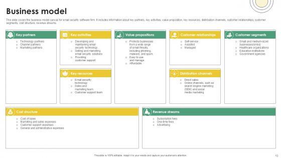 This slide covers the business model canvas for email security software firm. It includes information about key partners, key activities, value proposition, key resources, distribution channels, customer relationships, customer segments, cost structure, revenue streams. Boost your pitch with our creative Business Model Email And Data Protection Platform Capital Funding Pitch Deck PPT Template. Deliver an awe-inspiring pitch that will mesmerize everyone. Using these presentation templates you will surely catch everyones attention. You can browse the ppts collection on our website. We have researchers who are experts at creating the right content for the templates. So you do not have to invest time in any additional work. Just grab the template now and use them. This slide covers the business model canvas for email security software firm. It includes information about key partners, key activities, value proposition, key resources, distribution channels, customer relationships, customer segments, cost structure, revenue streams.