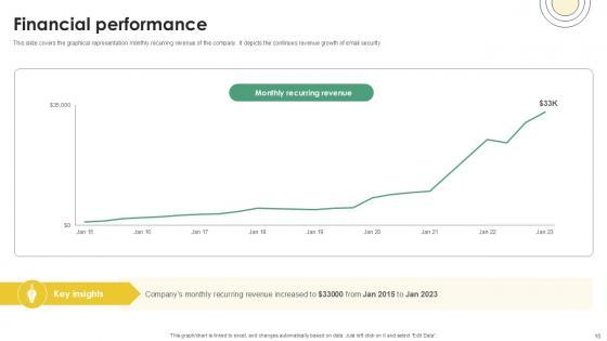 This slide covers the graphical representation monthly recurring revenue of the company. It depicts the continues revenue growth of email security. Slidegeeks is here to make your presentations a breeze with Financial Performance Email And Data Protection Platform Capital Funding Pitch Deck PPT Slide With our easy-to-use and customizable templates, you can focus on delivering your ideas rather than worrying about formatting. With a variety of designs to choose from, you are sure to find one that suits your needs. And with animations and unique photos, illustrations, and fonts, you can make your presentation pop. So whether you are giving a sales pitch or presenting to the board, make sure to check out Slidegeeks first This slide covers the graphical representation monthly recurring revenue of the company. It depicts the continues revenue growth of email security.