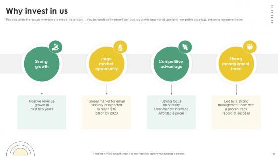 This slide covers the reasons for investors to invest in the company. It includes benefits of investment such as strong growth, large market opportunity, competitive advantage, and strong management team. The best PPT templates are a great way to save time, energy, and resources. Slidegeeks have 100 percent editable powerpoint slides making them incredibly versatile. With these quality presentation templates, you can create a captivating and memorable presentation by combining visually appealing slides and effectively communicating your message. Download Why Invest In Us Email And Data Protection Platform Capital Funding Pitch Deck PPT Example from Slidegeeks and deliver a wonderful presentation. This slide covers the reasons for investors to invest in the company. It includes benefits of investment such as strong growth, large market opportunity, competitive advantage, and strong management team.