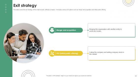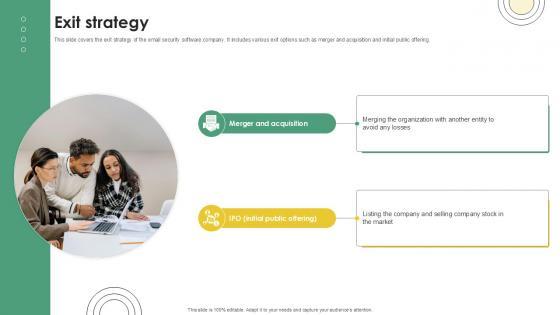This slide covers the exit strategy of the email security software company. It includes various exit options such as merger and acquisition and initial public offering. Present like a pro with Exit Strategy Email And Data Protection Platform Capital Funding Pitch Deck PPT Template. Create beautiful presentations together with your team, using our easy-to-use presentation slides. Share your ideas in real-time and make changes on the fly by downloading our templates. So whether you are in the office, on the go, or in a remote location, you can stay in sync with your team and present your ideas with confidence. With Slidegeeks presentation got a whole lot easier. Grab these presentations today. This slide covers the exit strategy of the email security software company. It includes various exit options such as merger and acquisition and initial public offering.