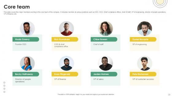This slide covers the major members working in the core team of the company. It includes member at various positions such as CEO, COO, Chief compliance officer, chief of staff, VP of engineering, director of people operations, VP of finance, etc. Get a simple yet stunning designed Core Team Email And Data Protection Platform Capital Funding Pitch Deck PPT Sample. It is the best one to establish the tone in your meetings. It is an excellent way to make your presentations highly effective. So, download this PPT today from Slidegeeks and see the positive impacts. Our easy-to-edit Core Team Email And Data Protection Platform Capital Funding Pitch Deck PPT Sample can be your go-to option for all upcoming conferences and meetings. So, what are you waiting for Grab this template today. This slide covers the major members working in the core team of the company. It includes member at various positions such as CEO, COO, Chief compliance officer, chief of staff, VP of engineering, director of people operations, VP of finance, etc.