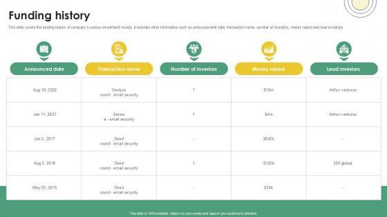 This slide covers the funding history of companys various investment rounds, it includes other information such as announcement date, transaction name, number of investors, money raised and lead investors. Whether you have daily or monthly meetings, a brilliant presentation is necessary. Funding History Email And Data Protection Platform Capital Funding Pitch Deck PPT Slide can be your best option for delivering a presentation. Represent everything in detail using Funding History Email And Data Protection Platform Capital Funding Pitch Deck PPT Slide and make yourself stand out in meetings. The template is versatile and follows a structure that will cater to your requirements. All the templates prepared by Slidegeeks are easy to download and edit. Our research experts have taken care of the corporate themes as well. So, give it a try and see the results. This slide covers the funding history of companys various investment rounds, it includes other information such as announcement date, transaction name, number of investors, money raised and lead investors.