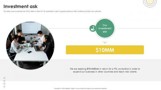 This slide covers investment ask of 10 million in return for 1 percent ownership in order to expand business in other countries and reach new customers. If your project calls for a presentation, then Slidegeeks is your go-to partner because we have professionally designed, easy-to-edit templates that are perfect for any presentation. After downloading, you can easily edit Investment Ask Email And Data Protection Platform Capital Funding Pitch Deck PPT Template and make the changes accordingly. You can rearrange slides or fill them with different images. Check out all the handy templates This slide covers investment ask of 10 million in return for 1 percent ownership in order to expand business in other countries and reach new customers.