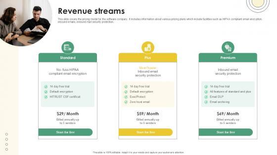 This slide covers the pricing model for the software company. It includes information about various pricing plans which include facilities such as HIPAA compliant email encryption, inbound emails, inbound mail security protection. This modern and well-arranged Revenue Streams Email And Data Protection Platform Capital Funding Pitch Deck PPT PowerPoint provides lots of creative possibilities. It is very simple to customize and edit with the Powerpoint Software. Just drag and drop your pictures into the shapes. All facets of this template can be edited with Powerpoint, no extra software is necessary. Add your own material, put your images in the places assigned for them, adjust the colors, and then you can show your slides to the world, with an animated slide included. This slide covers the pricing model for the software company. It includes information about various pricing plans which include facilities such as HIPAA compliant email encryption, inbound emails, inbound mail security protection.