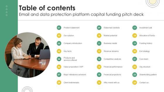Welcome to our selection of the Table Of Contents Email And Data Protection Platform Capital Funding Pitch Deck PPT Template. These are designed to help you showcase your creativity and bring your sphere to life. Planning and Innovation are essential for any business that is just starting out. This collection contains the designs that you need for your everyday presentations. All of our PowerPoints are 100Percent editable, so you can customize them to suit your needs. This multi-purpose template can be used in various situations. Grab these presentation templates today. Our Table Of Contents Email And Data Protection Platform Capital Funding Pitch Deck PPT Template are topically designed to provide an attractive backdrop to any subject. Use them to look like a presentation pro.