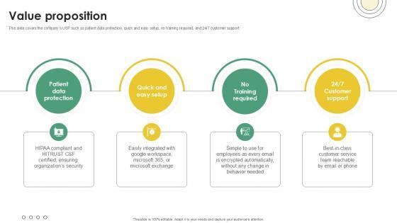 This slide covers the companys USP such as patient data protection, quick and easy setup, no training required, and 24x7 customer support. Explore a selection of the finest Value Proposition Email And Data Protection Platform Capital Funding Pitch Deck PPT Example here. With a plethora of professionally designed and pre-made slide templates, you can quickly and easily find the right one for your upcoming presentation. You can use our Value Proposition Email And Data Protection Platform Capital Funding Pitch Deck PPT Example to effectively convey your message to a wider audience. Slidegeeks has done a lot of research before preparing these presentation templates. The content can be personalized and the slides are highly editable. Grab templates today from Slidegeeks. This slide covers the companys USP such as patient data protection, quick and easy setup, no training required, and 24x7 customer support.