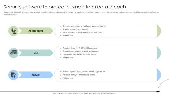The purpose of this slide is to highlight the available security tools to stay safe from data breaches. The popular security software are access control solutions, Security Information And Event Management SIEM tools, and antivirus software. Slidegeeks is one of the best resources for PowerPoint templates. You can download easily and regulate Security Software To Protect Business From Data Breach Data Fortification Strengthening Defenses for your personal presentations from our wonderful collection. A few clicks is all it takes to discover and get the most relevant and appropriate templates. Use our Templates to add a unique zing and appeal to your presentation and meetings. All the slides are easy to edit and you can use them even for advertisement purposes. The purpose of this slide is to highlight the available security tools to stay safe from data breaches. The popular security software are access control solutions, Security Information And Event Management SIEM tools, and antivirus software.