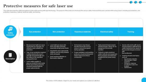 This slide describes the safety precautions to take while working with laser technology. The purpose of this slide is to showcase the various safety measures that users can take while using a laser, including eye protection, skin protection, hazardous material, electrical safety, and training. Do you have an important presentation coming up Are you looking for something that will make your presentation stand out from the rest Look no further than Fibers IT Protective Measures For Safe Laser Use. With our professional designs, you can trust that your presentation will pop and make delivering it a smooth process. And with Slidegeeks, you can trust that your presentation will be unique and memorable. So why wait Grab Fibers IT Protective Measures For Safe Laser Use today and make your presentation stand out from the rest This slide describes the safety precautions to take while working with laser technology. The purpose of this slide is to showcase the various safety measures that users can take while using a laser, including eye protection, skin protection, hazardous material, electrical safety, and training.