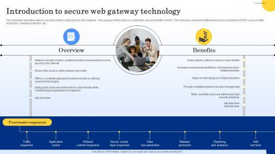 This slide talks about the network security solution called Secure Web Gateway. The purpose of this slide is to outline the various benefits of SWG. This slide also represents different working components of SWG such as traffic inspection, malware protection, etc. This Introduction To Secure Web Gateway Technology Web Threat Protection System is perfect for any presentation, be it in front of clients or colleagues. It is a versatile and stylish solution for organizing your meetings. The Introduction To Secure Web Gateway Technology Web Threat Protection System features a modern design for your presentation meetings. The adjustable and customizable slides provide unlimited possibilities for acing up your presentation. Slidegeeks has done all the homework before launching the product for you. So, do not wait, grab the presentation templates today This slide talks about the network security solution called Secure Web Gateway. The purpose of this slide is to outline the various benefits of SWG. This slide also represents different working components of SWG such as traffic inspection, malware protection, etc.