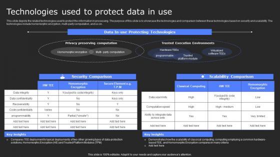 This slide depicts the related technologies used to protect the information in processing. The purpose of this slide is to showcase the technologies and comparison between these technologies based on security and scalability. The technologies include homomorphic encryption, multi-party computation, and so on. If you are looking for a format to display your unique thoughts, then the professionally designed Technologies Used To Protect Data In Use Secure Multi Party Template Pdf is the one for you. You can use it as a Google Slides template or a PowerPoint template. Incorporate impressive visuals, symbols, images, and other charts. Modify or reorganize the text boxes as you desire. Experiment with shade schemes and font pairings. Alter, share or cooperate with other people on your work. Download Technologies Used To Protect Data In Use Secure Multi Party Template Pdf and find out how to give a successful presentation. Present a perfect display to your team and make your presentation unforgettable. This slide depicts the related technologies used to protect the information in processing. The purpose of this slide is to showcase the technologies and comparison between these technologies based on security and scalability. The technologies include homomorphic encryption, multi-party computation, and so on.