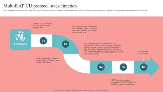 This slide depicts the functions of the multi RAT control unit protocol stack in the reference architecture of open RAN, including the processing protocols supported by this and specifications for present architecture. Do you have to make sure that everyone on your team knows about any specific topic I yes, then you should give Open Radio Access Network IT Multi RAT CU Protocol Stack Function Structure PDF a try. Our experts have put a lot of knowledge and effort into creating this impeccable Open Radio Access Network IT Multi RAT CU Protocol Stack Function Structure PDF. You can use this template for your upcoming presentations, as the slides are perfect to represent even the tiniest detail. You can download these templates from the Slidegeeks website and these are easy to edit. So grab these today.