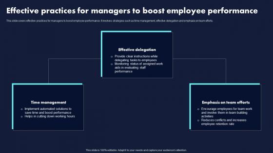 This slide covers effective practices for managers to boost employee performance. It involves strategies such as time management, effective delegation and emphasis on team efforts.Slidegeeks has constructed Effective Practices For Managers To Boost Proven Techniques For Enhancing Pictures Pdf after conducting extensive research and examination. These presentation templates are constantly being generated and modified based on user preferences and critiques from editors. Here, you will find the most attractive templates for a range of purposes while taking into account ratings and remarks from users regarding the content. This is an excellent jumping-off point to explore our content and will give new users an insight into our top-notch PowerPoint Templates. This slide covers effective practices for managers to boost employee performance. It involves strategies such as time management, effective delegation and emphasis on team efforts.
