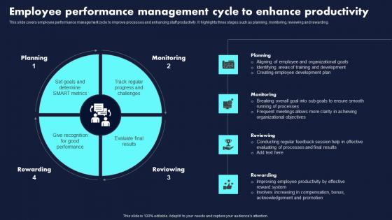 This slide covers employee performance management cycle to improve processes and enhancing staff productivity. It highlights three stages such as planning, monitoring, reviewing and rewarding.Here you can discover an assortment of the finest PowerPoint and Google Slides templates. With these templates, you can create presentations for a variety of purposes while simultaneously providing your audience with an eye-catching visual experience. Download Employee Performance Management Proven Techniques For Enhancing Guidelines Pdf to deliver an impeccable presentation. These templates will make your job of preparing presentations much quicker, yet still, maintain a high level of quality. Slidegeeks has experienced researchers who prepare these templates and write high-quality content for you. Later on, you can personalize the content by editing the Employee Performance Management Proven Techniques For Enhancing Guidelines Pdf. This slide covers employee performance management cycle to improve processes and enhancing staff productivity. It highlights three stages such as planning, monitoring, reviewing and rewarding.