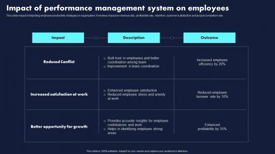 This slide impact of depicting employee productivity strategies in organization. It involves impact on revenue rate, profitability rate, retention, customer satisfaction and project completion rate.Do you have to make sure that everyone on your team knows about any specific topic I yes, then you should give Impact Of Performance Management System Proven Techniques For Enhancing Microsoft Pdf a try. Our experts have put a lot of knowledge and effort into creating this impeccable Impact Of Performance Management System Proven Techniques For Enhancing Microsoft Pdf. You can use this template for your upcoming presentations, as the slides are perfect to represent even the tiniest detail. You can download these templates from the Slidegeeks website and these are easy to edit. So grab these today. This slide impact of depicting employee productivity strategies in organization. It involves impact on revenue rate, profitability rate, retention, customer satisfaction and project completion rate.