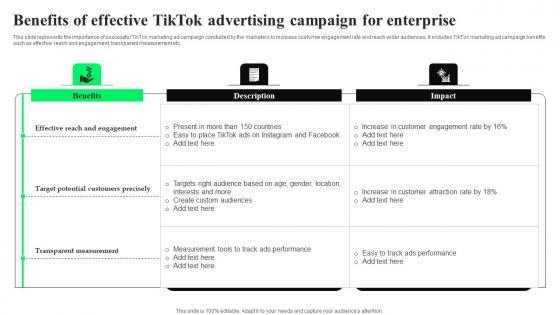 This slide represents the importance of successful TikTok marketing ad campaign conducted by the marketers to increase customer engagement rate and reach wider audiences. It includes TikTok marketing ad campaign benefits such as effective reach and engagement, transparent measurement etc. Get a simple yet stunning designed Benefits Of Effective TikTok Advertising TikTok Advertising Strategies To Provide Effective Icons Pdf. It is the best one to establish the tone in your meetings. It is an excellent way to make your presentations highly effective. So, download this PPT today from Slidegeeks and see the positive impacts. Our easy to edit Benefits Of Effective TikTok Advertising TikTok Advertising Strategies To Provide Effective Icons Pdf can be your go to option for all upcoming conferences and meetings. So, what are you waiting for Grab this template today. This slide represents the importance of successful TikTok marketing ad campaign conducted by the marketers to increase customer engagement rate and reach wider audiences. It includes TikTok marketing ad campaign benefits such as effective reach and engagement, transparent measurement etc.