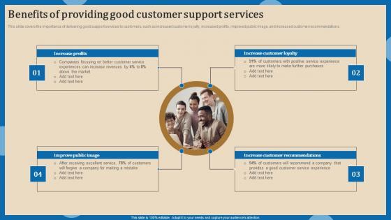 This slide covers the importance of delivering good support services to customers, such as increased customer loyalty, increased profits, improved public image, and increased customer recommendations. This modern and well-arranged Increasing Customer Benefits Of Providing Good Customer Support Services Designs PDF provides lots of creative possibilities. It is very simple to customize and edit with the Powerpoint Software. Just drag and drop your pictures into the shapes. All facets of this template can be edited with Powerpoint, no extra software is necessary. Add your own material, put your images in the places assigned for them, adjust the colors, and then you can show your slides to the world, with an animated slide included.