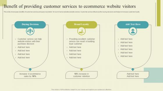 This slide showcases benefits of customer service and query resolution for ecommerce website website owners. Customer service influences the buying decision and helps to increase customer loyalty. Crafting an eye catching presentation has never been more straightforward. Let your presentation shine with this tasteful yet straightforward Benefit Of Providing Customer Services To Ecommerce Website Visitors Pictures PDF template. It offers a minimalistic and classy look that is great for making a statement. The colors have been employed intelligently to add a bit of playfulness while still remaining professional. Construct the ideal Benefit Of Providing Customer Services To Ecommerce Website Visitors Pictures PDF that effortlessly grabs the attention of your audience Begin now and be certain to wow your customers.