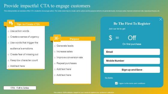 This slide provides an overview of the CTA created to encourage action. The slide covers tips to create call-to-action and its purpose which is to generate leads, increase sales, improve conversion rate, repeat purchases, etc. Slidegeeks has constructed Effective Customer Engagement With Direct Response Provide Impactful CTA To Engage Mockup Pdf after conducting extensive research and examination. These presentation templates are constantly being generated and modified based on user preferences and critiques from editors. Here, you will find the most attractive templates for a range of purposes while taking into account ratings and remarks from users regarding the content. This is an excellent jumping-off point to explore our content and will give new users an insight into our top-notch PowerPoint Templates. This slide provides an overview of the CTA created to encourage action. The slide covers tips to create call-to-action and its purpose which is to generate leads, increase sales, improve conversion rate, repeat purchases, etc.