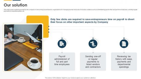 This slide covers solutions provided by the company in overcoming issues faced by organizations for managing human resources. It includes solutions such as administering payroll of full and part time employees, sending regular payments to respective parties, etc. Make sure to capture your audiences attention in your business displays with our gratis customizable Our Solution Payroll Solutions Provider Investor Funding Elevator Pitch Deck. These are great for business strategies, office conferences, capital raising or task suggestions. If you desire to acquire more customers for your tech business and ensure they stay satisfied, create your own sales presentation with these plain slides. This slide covers solutions provided by the company in overcoming issues faced by organizations for managing human resources. It includes solutions such as administering payroll of full and part time employees, sending regular payments to respective parties, etc.