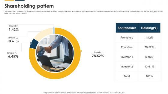 This slide covers understanding of the shareholding pattern of the company. The purpose of this template is to provide an overview on shareholders with maximum share and other stakeholders along with percentages of shares in the company with key insights. This Shareholding Pattern Payroll Solutions Provider Investor Funding Elevator Pitch Deck is perfect for any presentation, be it in front of clients or colleagues. It is a versatile and stylish solution for organizing your meetings. The Shareholding Pattern Payroll Solutions Provider Investor Funding Elevator Pitch Deck features a modern design for your presentation meetings. The adjustable and customizable slides provide unlimited possibilities for acing up your presentation. Slidegeeks has done all the homework before launching the product for you. So, do not wait, grab the presentation templates today This slide covers understanding of the shareholding pattern of the company. The purpose of this template is to provide an overview on shareholders with maximum share and other stakeholders along with percentages of shares in the company with key insights.