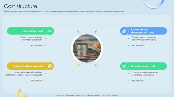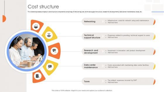 This slide showcases companys cost structure components comprising of networking cost, technical support structure, research and developments, data center maintenance, taxes, etc. Create an editable Cost Structure Tech Solutions Provider Company Business Model BMC SS V that communicates your idea and engages your audience. Whether you are presenting a business or an educational presentation, pre-designed presentation templates help save time. Cost Structure Tech Solutions Provider Company Business Model BMC SS V is highly customizable and very easy to edit, covering many different styles from creative to business presentations. Slidegeeks has creative team members who have crafted amazing templates. So, go and get them without any delay. This slide showcases companys cost structure components comprising of networking cost, technical support structure, research and developments, data center maintenance, taxes, etc.