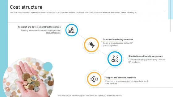 This slide showcases the distribution of expenses across key categories including marketing and sales, manufacturing and production, research and development and support and services. Create an editable Cost Structure Technology Solution Provider Business Model BMC SS V that communicates your idea and engages your audience. Whether you are presenting a business or an educational presentation, pre-designed presentation templates help save time. Cost Structure Technology Solution Provider Business Model BMC SS V is highly customizable and very easy to edit, covering many different styles from creative to business presentations. Slidegeeks has creative team members who have crafted amazing templates. So, go and get them without any delay. This slide showcases the distribution of expenses across key categories including marketing and sales, manufacturing and production, research and development and support and services.