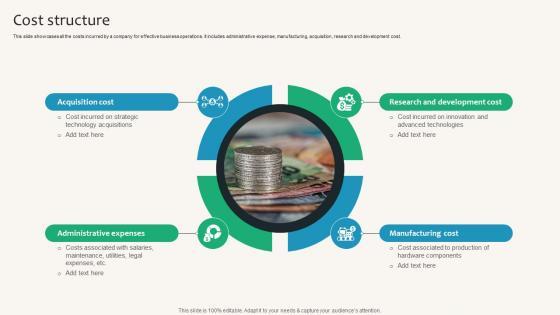 This slide showcases all the costs incurred by a company for effective business operations. It includes administrative expense, manufacturing, acquisition, research and development cost. Slidegeeks is one of the best resources for PowerPoint templates. You can download easily and regulate Cost Structure Cloud Networking Service Provider Business Model BMC SS V for your personal presentations from our wonderful collection. A few clicks is all it takes to discover and get the most relevant and appropriate templates. Use our Templates to add a unique zing and appeal to your presentation and meetings. All the slides are easy to edit and you can use them even for advertisement purposes. This slide showcases all the costs incurred by a company for effective business operations. It includes administrative expense, manufacturing, acquisition, research and development cost.