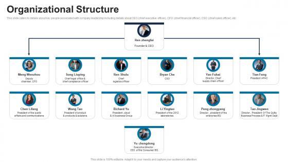 Mentioned slide provides information about organization chart. It demonstrates key roles such as CEO, COO, Global Marketing Officer, CFO, general counsel, Senior Executive external and legislative affairs, SVP, etc.Retrieve professionally designed Organization Structure Wireless Communication Services Provider Company Profile CP SS V to effectively convey your message and captivate your listeners. Save time by selecting pre-made slideshows that are appropriate for various topics, from business to educational purposes. These themes come in many different styles, from creative to corporate, and all of them are easily adjustable and can be edited quickly. Access them as PowerPoint templates or as Google Slides themes. You do not have to go on a hunt for the perfect presentation because Slidegeeks got you covered from everywhere. Mentioned slide provides information about organization chart. It demonstrates key roles such as CEO, COO, Global Marketing Officer, CFO, general counsel, Senior Executive external and legislative affairs, SVP, etc.