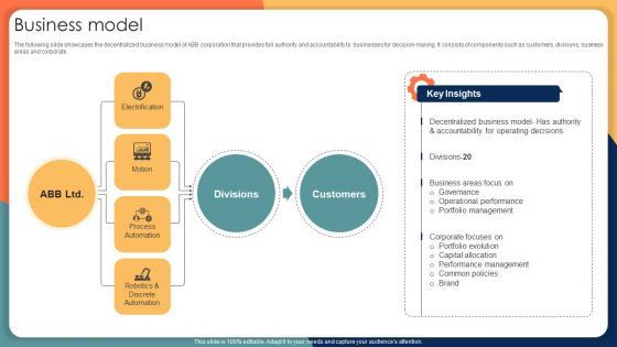 The following slide showcases the decentralized business model of ABB corporation that provides full authority and accountability to businesses for decision-making. It consists of components such as customers, divisions, business areas and corporate. Slidegeeks is one of the best resources for PowerPoint templates. You can download easily and regulate Business Model Engineering Solution Provider Company Profile CP SS V for your personal presentations from our wonderful collection. A few clicks is all it takes to discover and get the most relevant and appropriate templates. Use our Templates to add a unique zing and appeal to your presentation and meetings. All the slides are easy to edit and you can use them even for advertisement purposes. The following slide showcases the decentralized business model of ABB corporation that provides full authority and accountability to businesses for decision-making. It consists of components such as customers, divisions, business areas and corporate.
