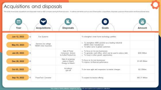 This slide showcases acquisitions and disposals made by ABB company during its financial years . It outlines elements such as year of transaction, acquisitions, disposals, purpose of transaction and transactional value. Find a pre-designed and impeccable Acquisitions And Disposals Engineering Solution Provider Company Profile CP SS V. The templates can ace your presentation without additional effort. You can download these easy-to-edit presentation templates to make your presentation stand out from others. So, what are you waiting for Download the template from Slidegeeks today and give a unique touch to your presentation. This slide showcases acquisitions and disposals made by ABB company during its financial years . It outlines elements such as year of transaction, acquisitions, disposals, purpose of transaction and transactional value.
